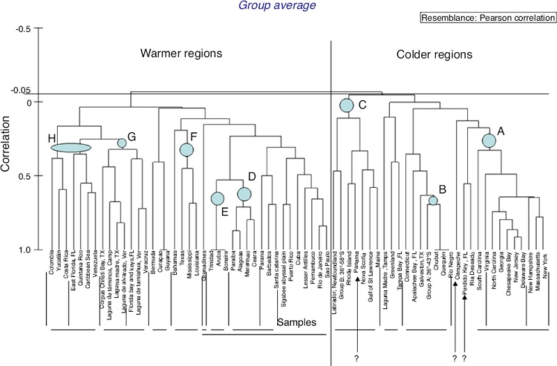 The mapping of the geographic distribution data of each of the 29 species recorded here made it possible to visually define 3 zoogeographic distribution patterns along the Western Atlantic from Newfoundland to Argentina: Warm and Caribbean with 5 species (17%), Warm Temperate and Caribbean with 18 species (62%) and Temperate with 6 species (21%). A hierarchical cluster analysis of the presence-absence matrix of geographic distribution data of the 29 amphipod species produced 2 groups at a correlation level of −0.05 (with other smaller groups at higher correlation levels). One group included the warmer regions of the Gulf of Mexico, Caribbean Sea and Brazil (+), and another group included the colder regions of the northern Gulf of Mexico, the eastern and northeastern United States, Canada, Greenland, and Argentina (●).
