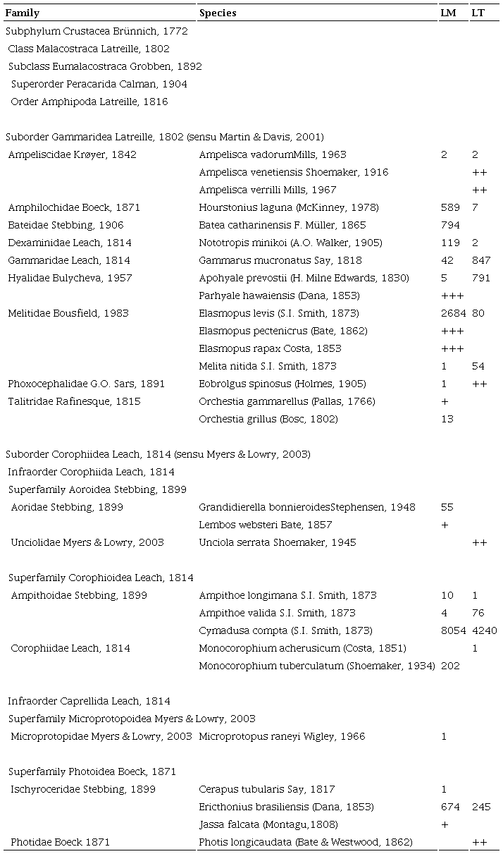 The specimens were observed in detail in order to insure a correct identification of the species. The families are listed in alphabetical order. The assignment of genera to families follows Bousfield (1973), Martín and Díaz (2003) and LeCroy, 2002, LeCroy, 2004, LeCroy, 2007. Exceptions are the Corophiidae that follow Myers and Lowry (2003) and the talitridan stat. nov. that follow Serejo (2004). The arrangement of genera and families included in the 2 latter works were adopted since they provide more recent phylogenetic evidence of relationships within the corophiidan and talitridan amphipods. The genera and species were identified following Barnard (1969), Bousfield (1973), Myers (1982), Myers and McGrath (1984), Ledoyer (1986), Conlan (1990), Barnard and Karaman (1991), Thomas (1993a), LeCroy, 2000, LeCroy, 2002, LeCroy, 2004, LeCroy, 2007, Myers and Lowry (2003), Appadoo and Myers (2004), and Serejo (2004). The species list follows Martin and Davis (2001) for the Suborder Gammaridea, Myers and Lowry (2003) for the Suborder Corophiidea, with an updating following Ahyong et al. (2011) and Horton, Lowry, and De Broyer (2013).