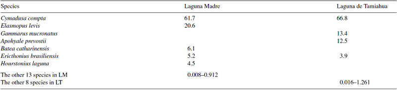 Cymadusa compta (S.I. Smith, 1873) was dominant in both lagoons with 63.4% of the overall total abundance. Of the 18 species collected in this study in Laguna Madre, 2 constitute 82.3% of the total abundance: C. compta (61.7%) and Elasmopus levis (S.I. Smith, 1873) (20.6%), and are followed by Batea catharinensis F. Müller, 1865 (6.1%), Ericthonius brasiliensis (Dana, 1853) (5.2%), Hourstonius laguna (McKinney, 1978) (4.5%), and the other 13 species with 0.008–0.912%. Of the 12 species collected in Laguna de Tamiahua, C. compta is markedly more abundant than the others with 66.8%, and is followed by Gammarus mucronatus Say, 1818 (13.4%), Apohyale prevostii (H. Milne Edwards, 1830) (12.5%), E. brasiliensis (3.9%), and the other 8 species with 0.016–1.261% (Table 3).