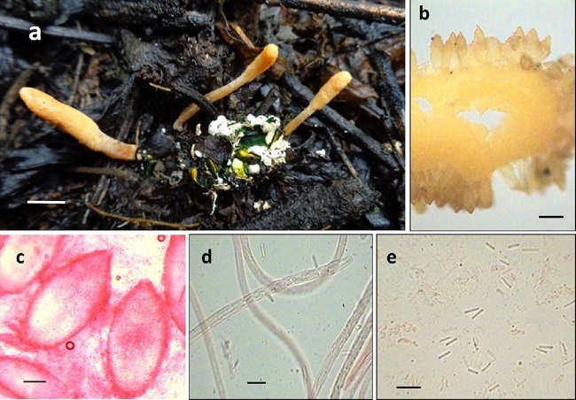 Estromas capitados, solitarios o subgregarios, que emergen de la cabeza del hospedero, de 1.5-2 cm de longitud. Parte fértil esférica, de 2-3 mm de longitud × 3.5-4 mm de diámetro, de color rojizo (B03609). Estípite cilíndrico, de 17-18 mm de largo × 1.5-2 mm de ancho, color crema (FBDD92) con tonos anaranjado claro (EA721D). Peritecios completamente inmersos y elongados, de 800-890 × 220-280 μm (n = 15). Ascas cilíndricas, de 5.8-7 μm de diámetro (n = 15). Ascosporas cilíndricas, hialinas, que se rompen en fragmentos individuales, de 7.5-8.7 × 1.3-1.9 μm (n = 15). Hospedero: larvas de coleóptero enterradas en el suelo. Hábitat: ecotono entre vegetación secundaria arbustiva de bosque de Juniperus y una zona agrícola.