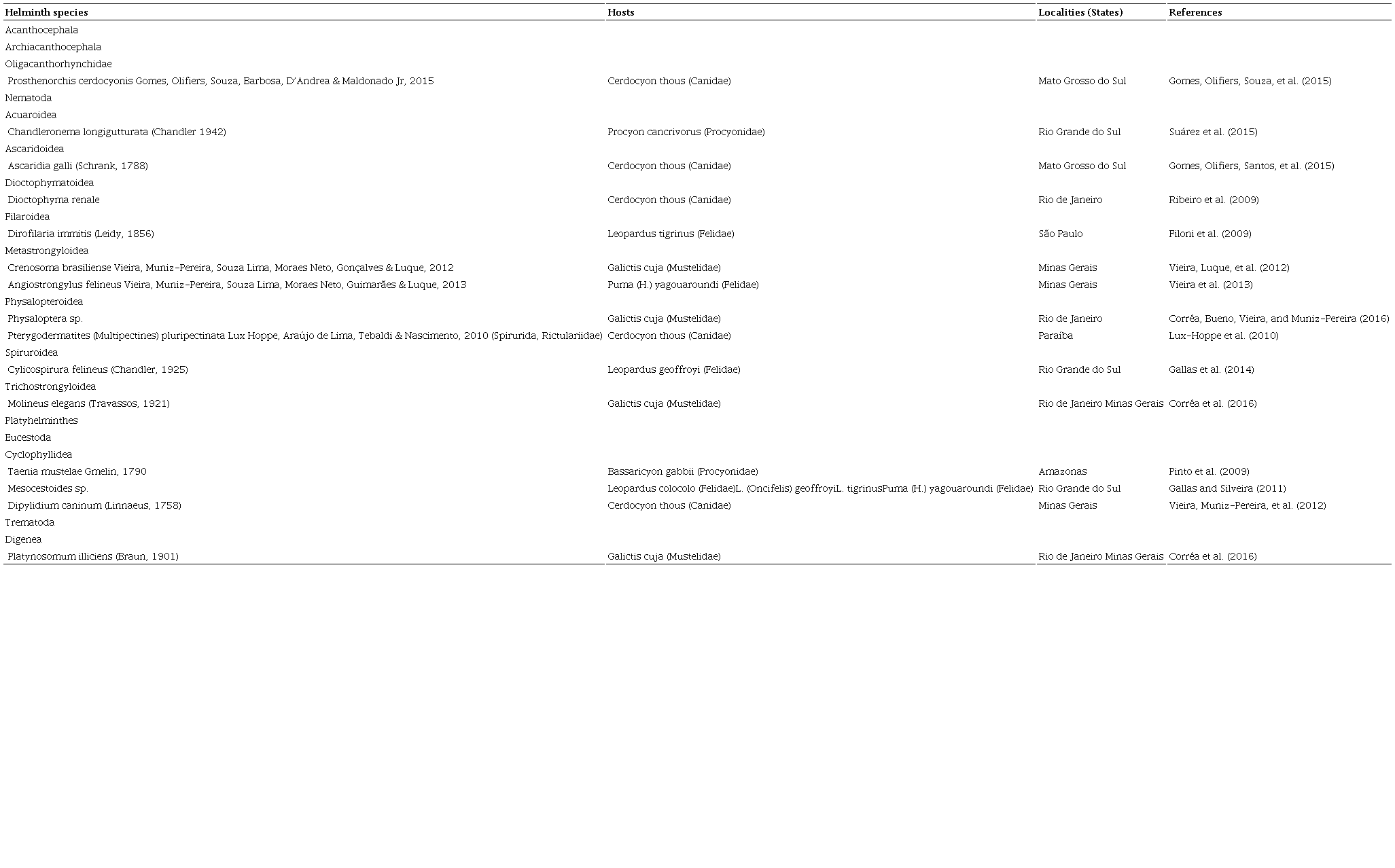 The most recent inventory of helminth parasites in wild carnivores in Brazil is the study of Vieira et al. (2008), which lists 95 helminth species in 21 species of this hosts group. After the publication of Vieira et al. (2008) and until the current study, no new information had been published about the helminth parasites of Brazilian wild carnivores (Table 2).