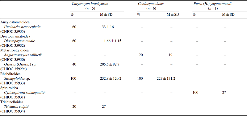 In the 3 wild carnivore mammal species studied herein, 7 nematodes species were recorded (Table 1). Oslerus (Oslerus) sp. (Filaroididae) was collected under the mucosa of the inner surface of the trachea and bronchii of C. brachyurus. Uncinaria stenocephala (Railliet, 1884) (Ancylostomatidae) was found in the small intestine of C. brachyurus. Specimens of Dioctophyma renale (Goeze, 1782) (Dioctophymatidae) were collected in the right kidney of C. brachyurus. Angiostrongylus raillieti (Travassos, 1927) (Angiostrongylidae) (=Angiostrongylus vasorum [Raillet, 1866] sensu Costa, Costa, & Guimarães, 2003) were registered in the pulmonary artery of C. thous. Unidentified Strongyloides sp. (Strongyloididae) specimens were collected in the small intestine of C. brachyurus and in C. thous. Trichuris vulpis (Froelich, 1789) (Trichuridae) were found in the intestinal caecum of C. brachyurus. Specimens of Cylicospirura subaequalis (Molin, 1860) (Spirocercidae) were collected from the cysts in the inner wall of the stomach of P. (H.) yagouaroundi.