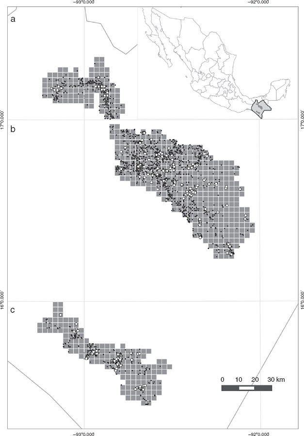 Mediante un modelo digital de elevaciones (Inegi, 2013) se identificaron las áreas del estado de Chiapas ubicadas por arriba de 1,500 m de altitud, cota altitudinal que se ha considerado útil para diferenciar la vegetación montana respecto a la tropical lluviosa (González-Espinosa y Ramírez-Marcial, 2013); además, en estas áreas coincide la existencia de datos provenientes de especímenes de herbario y de datos de inventarios florísticos o forestales. Se delimitaron 3 polígonos que corresponden a las Montañas del norte, Los Altos de Chiapas y la Reserva de la Biosfera El Triunfo (REBITRI). Las áreas elegidas se encuentran dentro de las regiones fisiográficas definidas por Müllerried (1957) denominadas: sistema de las Montañas del norte, región de la Meseta Central y la Sierra Madre de Chiapas, respectivamente (Fig. 1). Los polígonos incluyeron un número variable de celdas de 10 km2 de extensión cada una. Las capas de información obtenidas fueron estandarizadas con una proyección de coordenadas métricas para la zona 15 con el Datum WGS 84 y divididas en 617 cuadros o celdas de 10 km2 en el programa QGis (Quantum GIS, 2009).