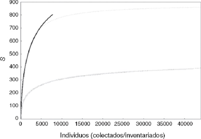 A nivel de especies, al modelar una curva de acumulación total para cada conjunto de datos se encontró que el número de especies estimado con los datos de inventarios se acumuló mucho más lentamente que cuando se utilizaron los especímenes de herbario. Con las curvas ajustadas por el modelo de Clench se estimó con el conjunto de datos de herbario el doble de especies esperadas que el correspondiente para los inventarios (Fig. 2).