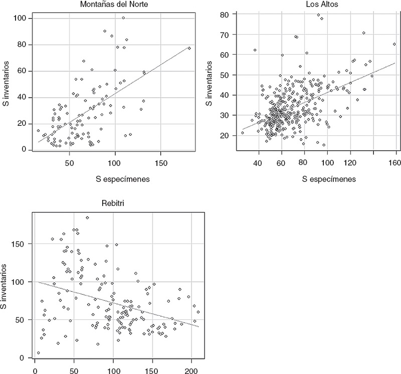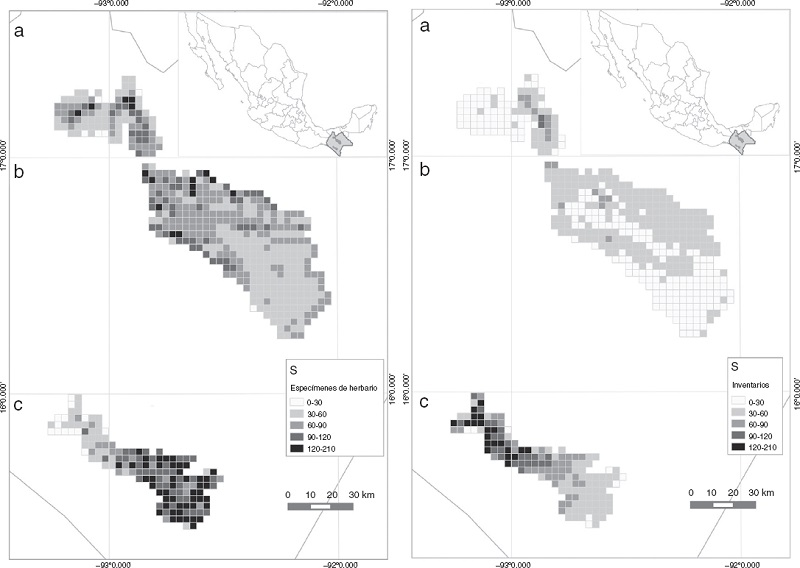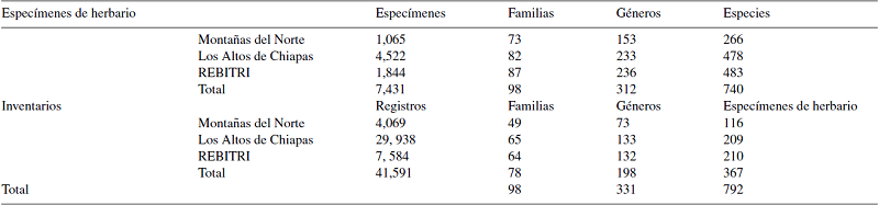 En ambos conjuntos de datos, a nivel de región, Los Altos de Chiapas resultó ser el área más extensa y más ampliamente recolectada o inventariada, seguida de la REBITRI y de las Montañas del norte. El número de familias, géneros y especies encontradas en las Montañas del norte fue el menor con ambos tipos de datos. El área con mayor riqueza de familias y géneros fue la REBITRI, tanto a partir de especímenes de herbarios como con información de inventarios. La riqueza de especies encontrada en la REBITRI y en Los Altos fue notablemente similar, independientemente de las diferencias en la extensión del área de ambas regiones y del tipo de datos que la documentan. Con ambas aproximaciones se encontró una diferencia de solo 5 especies (478 vs. 483 con el caso de especímenes) y 1 especie (209 vs. 210 en el caso de los inventarios) (Tabla 3).