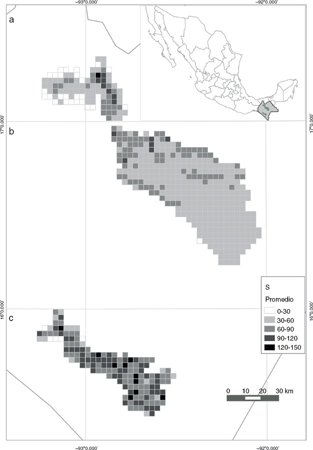 Al correlacionar el valor de S de las celdas que resultaron de ambos modelos, se obtuvo una relación muy baja, pero significativa (r = 0.18, p < 0.001, N = 617). Los valores estimados por el modelo derivado de datos de inventarios fueron, en promedio, menores a las estimaciones con los datos de herbarios. En 2 de las 3 regiones estudiadas, se encontró una relación positiva de la riqueza de especies estimada a partir de ambos conjuntos de datos, con r ≥ 0.5. Al contrario, en la región de la REBITRI se observó una r = −0.38 (Fig. 4). Finalmente, al promediar los valores de S obtenidos en cada celda con ambos modelos, se obtuvo un mapa con valores más conservadores (Fig. 5). Resalta la mayor riqueza local promedio de la REBITRI respecto a las otras 2 regiones estudiadas.