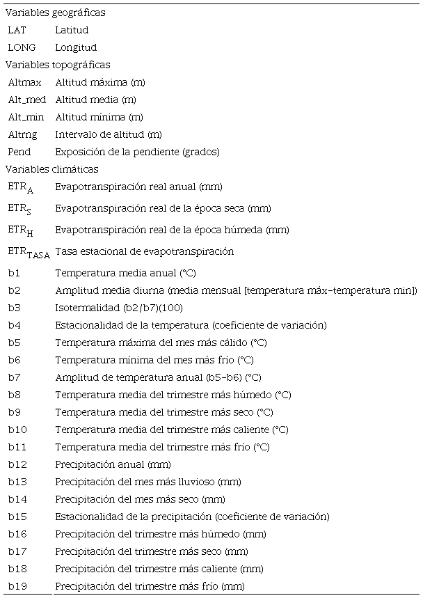 Se obtuvieron las variables climáticas y topográficas reproyectadas para México (Tabla 2; Cuervo-Robayo et al., 2013, Inegi, 2013). Cada capa fue proyectada y muestreada para la resolución del análisis con el método de interpolación bilineal. Se extrajeron los valores por celda con la estandarización de los datos a valores de media igual a cero y varianza igual a uno. La latitud y longitud fueron estandarizadas al restar el valor de la media a cada caso (Hortal y Lobo, 2002). Solo se utilizaron variables climáticas y topográficas (Tabla 2). Se calcularon 3 variables adicionales: la evapotranspiración real anual (ETRA) y la de las épocas seca (ETRS) y húmeda (ETRH) con la fórmula de Turc (1954, «fide» González-Espinosa et al., 2004).