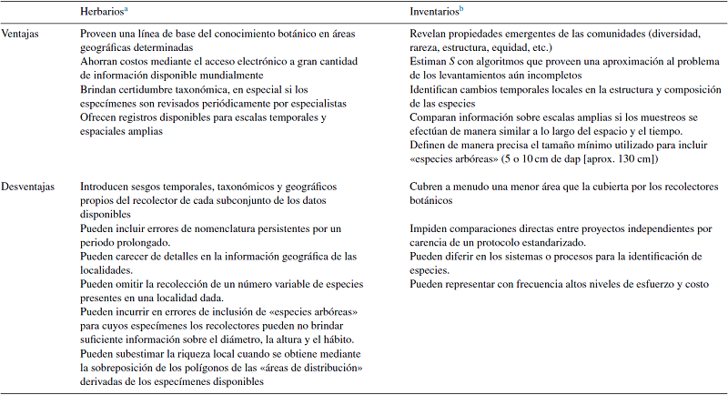 La riqueza de especies de árboles determina los patrones de diversidad de especies de plantas y animales y sus funciones en los bosques tropicales (Janzen, 1970, Novotny et al., 2006). Por ende, su estimación adecuada es esencial para establecer las necesidades y priorizar las acciones para la conservación y el manejo sustentable de los ecosistemas forestales (Hubbell et al., 2008). Recientemente, se ha suscitado el interés por proponer estimaciones del número de especies de árboles en los bosques tropicales con un doble fin: 1) establecer una línea de base para dar seguimiento a la variación de la riqueza de especies en función de cambios de ámbitos regional o global provocados por las actividades humanas (Hubbell et al., 2008, Slik et al., 2015, Ter-Steege et al., 2013) y, a la vez, 2) profundizar en la naturaleza de los datos y su interacción con los métodos de estimación (por ejemplo, Cayuela, Gotelli y Colwell, 2015). De manera general, se recurre al uso de 2 tipos de datos sobre la riqueza de especies de árboles tropicales: los obtenidos de las etiquetas de los especímenes depositados en herbarios y aquellos obtenidos mediante inventarios florísticos (o más a menudo con fines de manejo forestal; Baraloto et al., 2013, Cayuela et al., 2012). Sin embargo, las estimaciones disponibles con frecuencia no discuten las implicaciones que pueden derivarse del uso de uno u otro tipo de datos. La Tabla 1 resume las principales ventajas y limitaciones inherentes a estos 2 tipos de información.