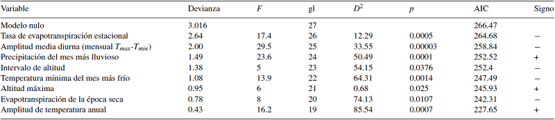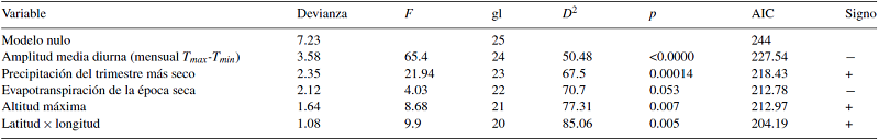 Con el conjunto de datos de especímenes de herbario se encontraron 27 celdas que se pudieron considerar como bien muestreadas, con las que se eligió el modelo de S con base en el criterio de información de Akaike (AIC). El modelo que presentó el valor más bajo de AIC fue: