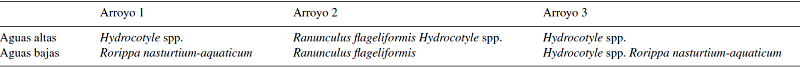Los datos sobre las macrófitas dominantes en cada arroyo y período hidrológico se resumen en la Tabla 1. La cobertura del lecho varió entre los arroyos, destacándose el arroyo 1 con un porcentaje de cobertura de macrófitas marcadamente mayor (70%) que los arroyos 2 y 3 (entre 1% y 10% de cobertura). La velocidad de corriente media de los tramos estudiados fue de 0.46 m/s en aguas altas y de 0.27 m/s en aguas bajas, mientras que la profundidad media varió entre 0.20 m y 0.12 m en aguas altas y bajas respectivamente. La temperatura media del agua durante el periodo de alto caudal fue de 18.8 °C y en bajo caudal fue de 15 °C. La conductividad osciló entre 14 μS/cm y 179 μS/cm y el rango de pH estuvo entre 7.6 y 9.6.