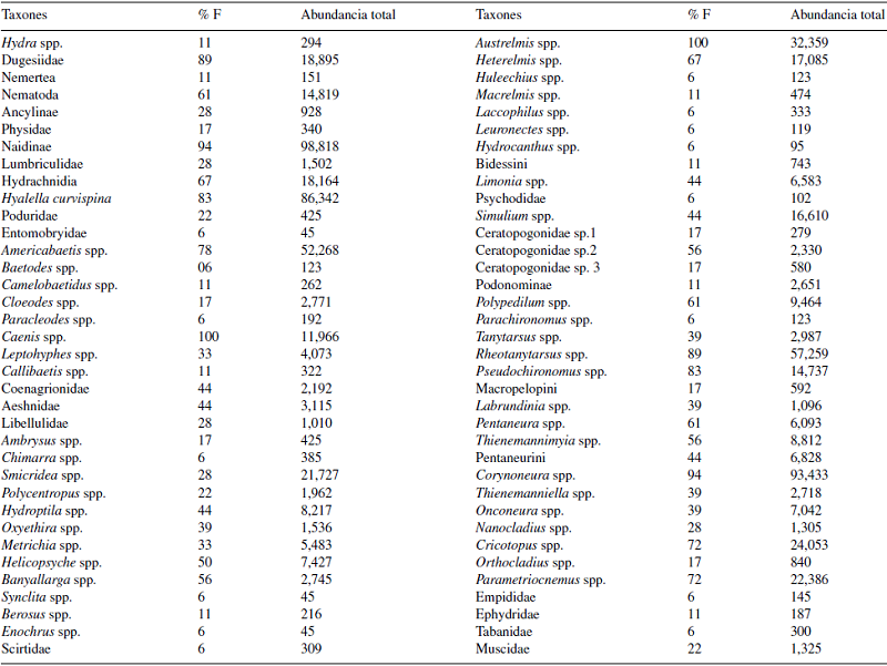 Se identificaron 72 taxones de macroinvertebrados fitófilos (Tabla 2). Los más frecuentes y abundantes fueron Naidinae, Hyallela curvispina Shoemaker, 1942, Americabaetis spp., Corynoneura spp. y Rheotanytarsus spp. Las curvas de rango abundancia mostraron una diferenciación estacional en la composición taxonómica de los ensambles (Fig. 1). Durante el período de aguas bajas Naidinae fue dominante, mientras que en el período de aguas altas dominó junto con Corynoneura spp. En el periodo de aguas bajas se observó una disminución marcada de la abundancia de Parametriocnemus spp., Austrelmis spp., Pseudochironomus spp. y Dugesidae, y un incremento en la densidad de Americabaetis spp., Rheotanytarsus spp. y Cricotopus spp.