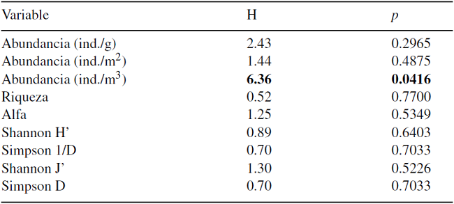 La caracterización estructural de los ensambles se determinó mediante el cálculo de la abundancia total y de los índices de diversidad de Shannon, Simpson y Alfa, y de equitatividad de Shannon y de dominancia de Simpson (Magurran, 1988). Se realizaron pruebas de Kruskal-Wallis para comparar los atributos estructurales de los ensambles de macroinvertebrados entre las diferentes especies de macrófitas utilizando el programa INFOSTAT (Di Rienzo et al., 2012). Los análisis se realizaron para todos los índices de diversidad y equitatividad y para las 3 medidas de abundancia de macroinvertebrados (ind./m3, ind./m2 e ind./g de peso seco de macrófita).