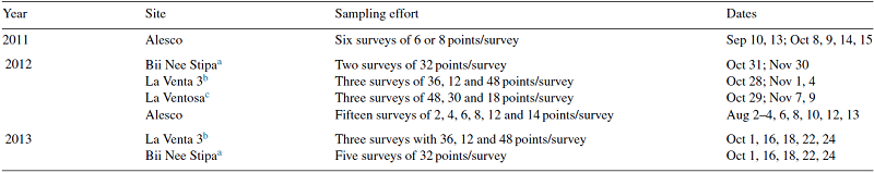 At the time of our observations, La Venta II was an operational wind farm whose area was composed by a matrix of pastureland, sorghum crops, and patches of deciduous dry forest (16°35′29.45″ N, 94°48′41.91″ W; 36 m asl). In 2010, we worked at Unión Fenosa, at the time it was an area proposed for the development of a wind-energy project; most of its area was covered by deciduous dry forest but also had portions of pastureland (16°26′0.94″ N, 94°48′36.61″ W; 13 m asl). In 2011 we worked in 3 sites: La Venta II, Alesco and Oaxaca 1; Alesco was an area proposed for wind-energy development covered mainly by deciduous dry forest and pastureland (16°27′28.24″ N, 94°54′36.54″ W; 5 m asl); Oaxaca 1 was a wind farm on the final stage of construction (not operating yet), the area not occupied by service roads or service areas for wind turbines was covered by deciduous dry forest (16°33′42.60″ N, 94°42′42.93″ W; 39 m asl). In 2012, we worked at La Venta II and Peñoles; the latter was an operational wind farm, with most of its area covered by deciduous dry forest (16°35′12.18″ N, 94°59′53.62″ W; 66 m asl). In 2013, we worked in La Venta II, Oaxaca 1 and C.E. Santo Domingo; C.E. Santo Domingo was an operational wind farm with wind turbines intermixed with sorghum crops (16°30′31.82″ N, 94°46′27.76″ W; 22 m asl); Figure 1 shows the location of our study sites, and the arrangement of wind turbines for those operational wind farms. Monitoring periods, as well as starting and ending dates of observations, differed each year (Fig. 2).