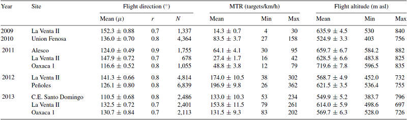 The objective of this study is to describe the patterns of nocturnal migratory traffic rates (MTR), defined as the number of targets passing across 1 km of migratory front per hour (targets/km/h), flight directions, flight altitudes, and species of nocturnal migrants observed from the Pacific side of the Isthmus of Tehuantepec, within one of the most important Wind Resource Areas of Mexico (Alemán-Nava et al., 2014). For this, we used data collected with a single marine radar unit and point counts during 5 consecutive fall seasons (2009–2013), from different operational or proposed wind farms, under request by different wind-energy companies that were required to carry out environmental studies by the environmental authorities of Mexico. This work also aims to make public information that otherwise would remain in gray literature, informing society, conservation organizations, decision makers, and others interested in bird migration in the region.