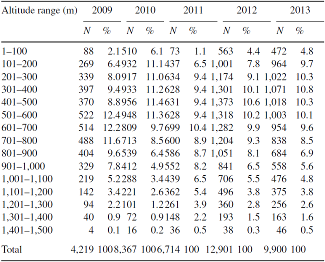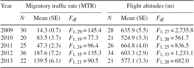 We found some general patterns in nocturnal bird migration characteristics such as: (1) flight directions heading to the southeast each year, (2) peak MTRs occurring during mid-October to early November, (3) MTRs generally peaking 3–4 h after sunset and decreasing thereafter, (4) seasonal mean flight altitudes ranging between ~520 and ~720 m agl, and (5) <7% of detected targets flying below 100 m agl every year.