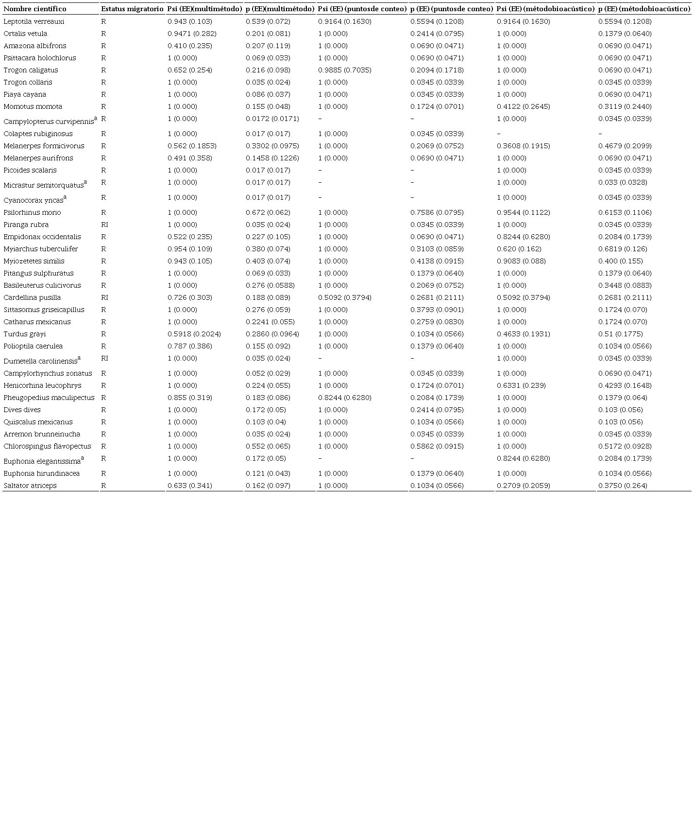 Las probabilidades de detección (p), así como la proporción de área total ocupada por cada especie (psi) calculadas con ambos métodos por separado y por el muestreo combinado se pueden apreciar en la Tabla 1. Por ejemplo, las especies Leptotila verreauxi, Psilorhinus morio y Chlorospingus flavopectus tuvieron una p relativamente alta, mientras que T. collaris, D. carolinensis y P. rubra tuvieron una p muy cercana a cero. En general, se obtuvieron resultados muy similares tanto de probabilidades de detección como de ocupación mediante el uso de ambas técnicas por separado y con la combinación de métodos. Se registraron 2 especies con categoría “sujeta a protección especial” según la NOM-059-SEMARNAT-2010 (Semarnat, 2010) cuyas probabilidades de detección fueron muy bajas: M. semitorquatus (p = 0.017) y T. collaris (p = 0.035) (Tabla 2).