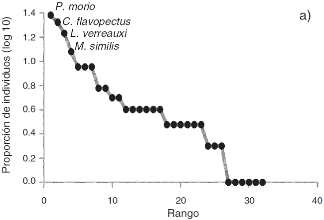 Se encontró una alta concordancia entre las curvas de rango abundancia obtenidas por cada método usado de manera independiente y de forma conjunta, con las mismas especies más abundantes (Fig. 1). Esto indica que, en general, hay consistencia en los datos de abundancias relativas obtenidas con ambos métodos.