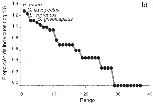 Los bosques tropicales son ecosistemas con una alta diversidad de especies de aves (Karr, 1981). La comunidad de aves estudiada presentó una alta PEI, lo que corresponde a un valor alto de diversidad. Aunque se esperaba que tanto la combinación de métodos como el método bioacústico (por su gran capacidad de detectar los individuos en campo), o los puntos de conteo (por la inclusión de detecciones tanto vistas como escuchadas) por separado mostraran mayor o menor número de detecciones, estas fueron consistentes en el valor calculado de la PEI y en las curvas de rango abundancia, con las mismas especies más dominantes (P. morio, C. flavopectus y L. verreauxi). Este hallazgo es consistente con lo descrito por Hobson et al. (2002), en el sentido de una alta concordancia entre los valores de abundancias relativas obtenidos con ambas técnicas (aunque cabe resaltar que ellos trabajaron en bosques boreales). Esto es importante porque demuestra que el método bioacústico puede generar datos de abundancia relativa consistentes para estimar la diversidad de las comunidades de aves.