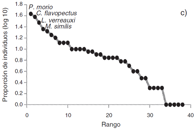 Por medio del programa ESTIMATES 7.5 (Colwell, 2009), se generó una curva de acumulación de especies y se calculó el estimador de riqueza no paramétrico Chao 1. Se eligió este estimador de riqueza porque se basa en datos de abundancia (número de especies representadas por un individuo en la muestra o “singletons” y el número de especies representadas por 2 individuos en la muestra o “doubletons”) y porque tiene un buen desempeño cuando las muestras son pequeñas (Hortal, Borges y Gaspar, 2006). De esta manera, mediante la comparación de las especies observadas y estimadas, se calculó la eficiencia de muestreo o completitud del inventario. Para expresar la diversidad (número de especies y distribución de la abundancia de individuos: Morin, 2011) de la comunidad se calculó la probabilidad de encuentro interespecífico (PEI) (Gotelli, 2008), el cual es insensible al número de individuos en la muestra y es de fácil interpretación. Este valor oscila entre 0 (cuando la comunidad está compuesta por uno o varios individuos de una sola especie) y 1 (cuando todas las especies que integran la comunidad están representadas por exactamente el mismo número de individuos). Para describir la estructura y la composición de la comunidad se utilizaron curvas de rango de abundancia (Magurran y McGill, 2011) y se resaltaron las 4 especies más abundantes.