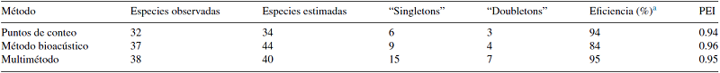 Específicamente, el estimador de riqueza Chao 1 mostró que la mayor completitud de muestreo se realizó por medio de los puntos de conteo y la combinación de métodos. El método bioacústico no resultó tan eficiente en cuanto al porcentaje de completitud, lo que seguramente se debió a la mayor cantidad de “singletons” (especies representadas por un solo individuo en la muestra), que es un parámetro utilizado por el estimador Chao 1 para calcular el número de especies no detectadas (Gotelli, 2008). Seguramente, si se aumentara el tiempo de muestreo, las especies que se registraron como “singletons” y “doubletons” se volverían más abundantes en las muestras. Sin embargo, hay algunas especies como M. semitorquatus, T. collaris y A. brunneinucha que son raras en el sitio. Otras especies “singletons” como D. carolinensis y P. rubra son migratorias y comunes en la región en temporada de invernada. Sin embargo, al momento de muestreo pudieron haber sido raras debido a que en dicha época la mayoría habrían migrado hacia el norte. Para las especies migratorias, sería necesario muestrear en plena temporada de invernada, aunque otros métodos, como el uso de redes niebla, han sido más utilizados para estudiar a este grupo de aves en los trópicos (véase Karr, 1981). Con base en la proporción de especies registradas y estimadas, es probable que con un muestreo más se hubiese obtenido una eficiencia de muestreo muy cercana al 100%.