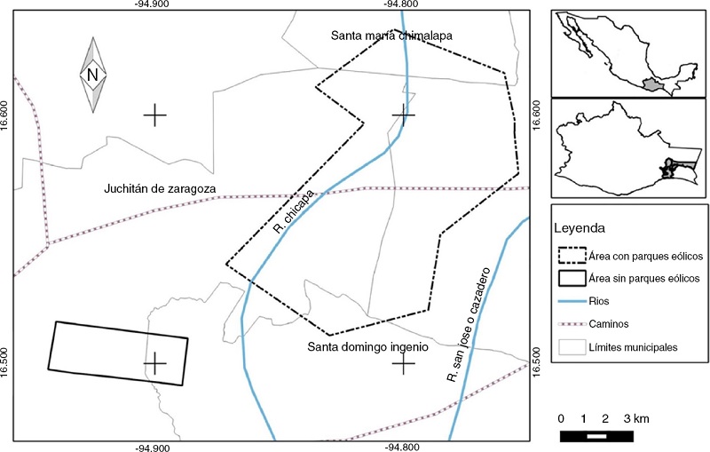 El área de estudio se ubica al sureste de México, en el istmo de Tehuantepec, Oaxaca. Es una de las zonas de mayor potencial eólico del país y del mundo, con vientos promedio de 7.7-8.5 m/s a 50 m sobre el suelo, calificados como excelentes para la producción de energía eólica y presentes durante todo el año (Elliott et al., 2004; Fig. 1). El clima es cálido subhúmedo (Aw) con una temperatura media anual de 22-26 °C. La precipitación media anual va de 1,000 a 1,200 mm (Trejo, 2004). En esta región existen grandes extensiones de terrenos con alto grado de fragmentación, utilizados para agricultura de riego y temporal y cría de ganado bovino. Posee escasos corredores de vegetación arbórea con huizaches (Acacia sp.) y huamúchiles (Phithecellobium dulce), y con pequeños remanentes de bosque tropical caducifolio. El mayor afluente de la zona es el río Tehuantepec. Además, existen canales de riego para irrigar los pastizales y cultivos agrícolas, principalmente de maíz y sorgo (Inegi, 2013).