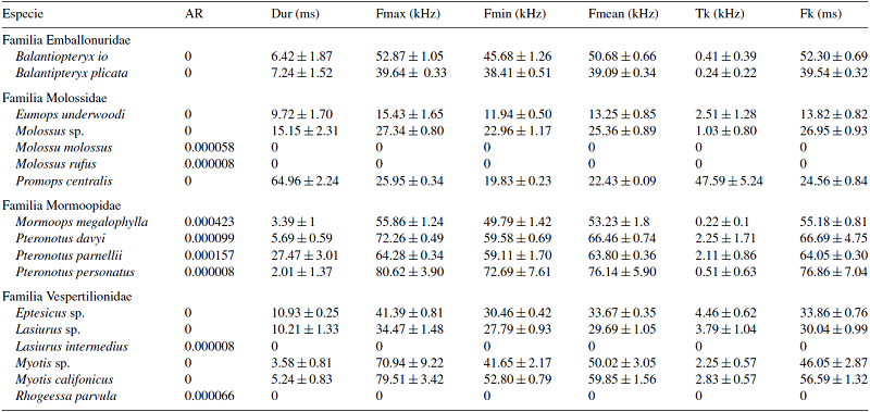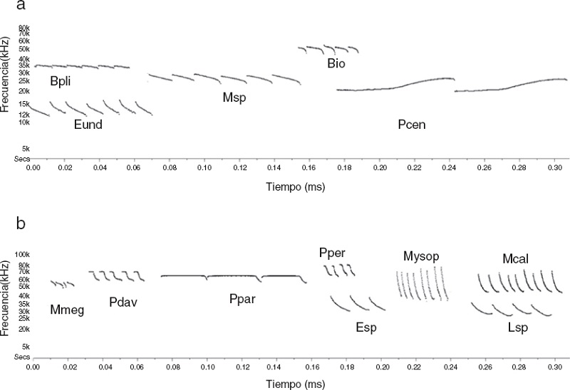 Para la determinación taxonómica de especies, o en su caso de los sonotipos, se midieron 6 parámetros de cada llamado (Dur: duración, Fmax: frecuencia máxima, Fmin: frecuencia mínima, fmean: frecuencia media, Tk: tiempo de inicio del llamado a la inflexión o rodilla, y Fk: frecuencia de la inclinación o rodilla; O’Farrell et al., 1999). La visualización de llamados se realizó en una división de frecuencia 16, con el eje de tiempo (x) en intervalos divididos cada 10 ms y eje de frecuencia (y) en escala logarítmica (kHz).