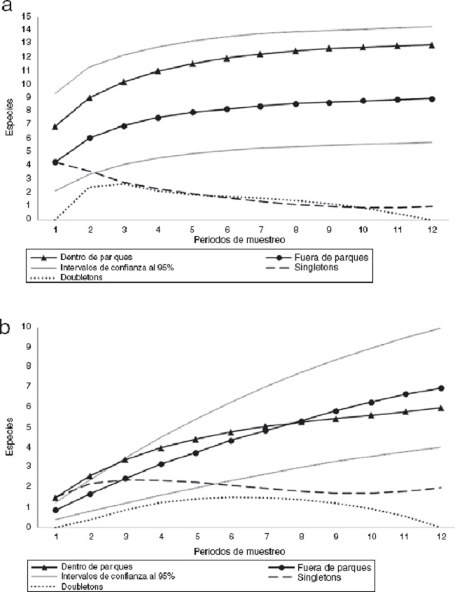 Las curvas de acumulación de especies no alcanzaron la asíntota para ambas áreas. En el área DPE la riqueza estimada fue de 6.92 especies con Chao 2 y de 6.78 especies con Bootstrap (Sobs = 6), por lo que se registraron el 86.71 y el 88.50% de la riqueza de especies estimada, respectivamente. Para el área FPE, con los estimadores Chao 2 (Sobs = 7 y Sest = 8.38) y Bootstrap (Sobs = 7 y Sest = 8.74) se registraron el 83.53 y el 80.09% de la riqueza de especies esperada (Fig. 3b).