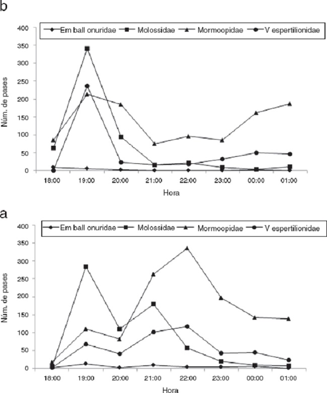 La representación de la actividad de los murciélagos por horas se agrupó por familia y área, dado que mostraba patrones similares por especies y por sitios (Fig. 4). Para el área DPE se registró actividad a las 19:00 h y entre las 22:00 y las 23:00 h. En el área FPE se observaron 2 picos de actividad, a las 19:00 y entre a las 24:00 y la 01:00 h. La familia Emballonuridae tuvo escasa representación, por lo que no se observó un patrón definido. La Molossidae tuvo mayor actividad entre las 19:00 y las 20:00 h en ambas áreas. La Mormoopidae mostró mayor actividad en el área DPE de las 19:00 a las 20:00 h y de las 22:00 a las 23:00 h (Fig. 4a). De manera similar, en el área FPE se registraron 2 picos de actividad (Fig. 4b). La Vespertilionidae mostró actividad en el área DPE a lo largo de la noche, sin picos bien definidos; en contraste, en los sitios FPE se observó un pico a las 19:00 h. En el análisis de los horarios de actividad se observó que el área DPE, las 19:00 y las 20:00 h acumularon el 18.88 y el 11.04% (n = 853, 499) de pases, respectivamente, mientras que en el área FPE las 19:00 h acumuló el 17.66% de pases (n = 798). A través del análisis de los intervalos de actividad se encontró que hay diferencias significativas entre los pases registrados por hora (H = 48.78, g.l. = 7, p = 0.0001).