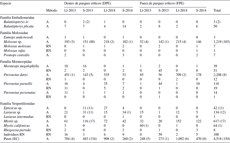 En estudios de la región neotropical, mediante el método de redes en Brasil, se identificaron 10 especies, 7 artropodívoras (Barros et al., 2015), mientras que en Puerto Rico se registraron 11, 5 artropodívoras (Rodríguez-Durán y Feliciano-Robles, 2015); en ambos estudios el número de especies identificadas es menor a las registradas en este trabajo. Lo anterior se atribuye al sesgo que tienen las redes en la captura de especies; se ha documentado que el uso de detectores de ultrasonido incrementa el registro de especies un 30 a 40% (MacSwiney et al., 2008, Pech-Canché et al., 2010). Esto resulta importante si se considera que la mayoría de las especies en las que se han registrado altas tasas de mortalidad por choque con las aspas de los aerogeneradores pertenecen a especies artropodívoras (Bolívar-Cimé et al., 2016, Kunz et al., 2007b). De la misma manera, se han realizado otros trabajos con mamíferos en la región del istmo de Tehuantepec, como el de Cervantes y Yépez (1995) (26 especies de murciélagos, 8 artropodívoras) y el de López, Lorenzo, Barragán y Bolaños (2009) (28 especies, 9 artropodívoras), que reportan más especies que las de este trabajo, debido a que no solo consideran registros resultado de trabajo de campo sino también registros de colecciones.