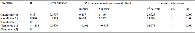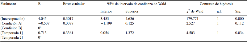 Se registró el mayor porcentaje de EC en el área DPE (92.2%), en la temporada seca (88.96%) y en el año 2013 (93.50%). A partir del análisis con un MLG, se observaron diferencias significativas para condición (χ2 de Wald = 28.49, g.l. = 1, p = 0.00) y temporadas (χ2 de Wald = 56.77, g.l. = 1, p = 0.00; Tabla 4).