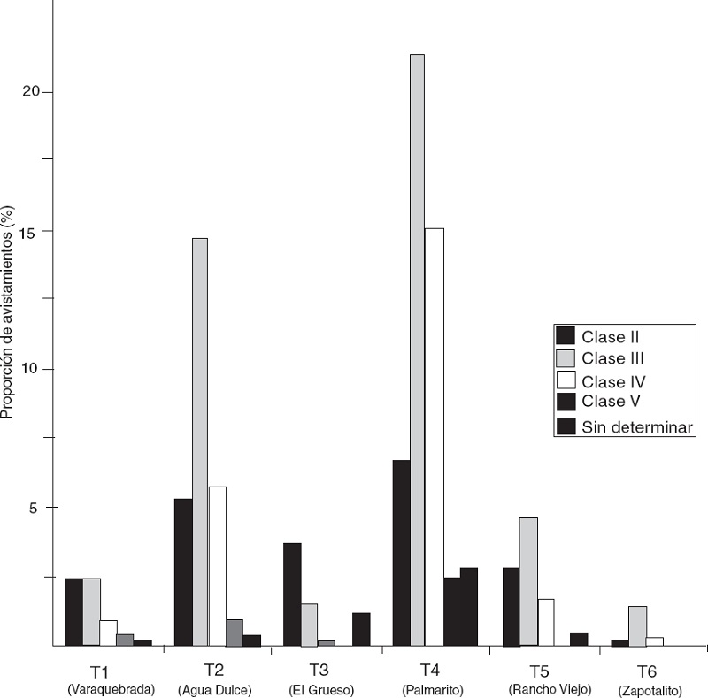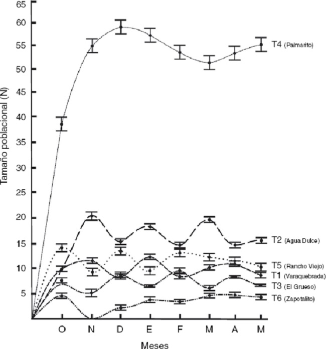 La estructura de la población por localidad muestra que el transecto Palmarito presentó los porcentajes más altos respecto al avistamiento de ejemplares de la clase V (2.5%), IV (15.2%), III (21.4%) y II (6.7%), seguidos del transecto Agua dulce (0.9, 5.7, 14.8 y 5.3%) en el mismo orden de clases. El transecto Zapotalito presentó los porcentajes más bajos de avistamiento. En este trabajo no se observaron organismos de la clase I en ninguno de los transectos recorridos (Fig. 2). El tamaño poblacional total estimado por transecto fluctuó entre 2.8 y 47.9 individuos. De manera general, la mayor abundancia de individuos se presentó en el transecto Palmarito (47.9 ± 0.4 individuos) de la localidad del mismo nombre, mientras que la más baja se encontró en el transecto Zapotalito (2.8 ± 0.3 individuos) de la localidad de Cerro Hermoso. Estos resultados fueron significativamente diferentes (Chi cuadrada = 56.43, g.l. = 11, p < 0.05) entre todas las localidades. Temporalmente, la mayor abundancia se registró en el mes de enero en el transecto Palmarito (74.9 ± 0.5 individuos) y la menor en el mes de marzo en el transecto Zapotalito (1.9 ± 0.3 individuos) (Fig. 3).
