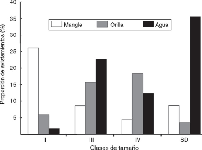 En cuanto a la frecuencia de uso por ambientes al momento de los conteos, se encontraron diferencias significativas en la abundancia por mes de muestreo (Andeva: F29,97 = 2.86, p < 0.05) y por clase de edad (Andeva: F6,86 = 15.497, p < 0.05). Además, se comprobó la existencia de una interacción significativa entre los 3 factores: mes, hábitat y clase de edad (Andeva: F48,97 = 2.714, p < 0.05), demostrando que la actividad de los organismos depende del tamaño y mes de muestreo. Los adultos reproductores (clase V) y adultos (clase IV) fueron observados en mayor proporción nadando en el agua (3 y 15%, respectivamente), mientras que los subadultos (clase III) y juveniles (clase II) fueron observados entre las raíces del manglar (20 y 10%, respectivamente). De los ejemplares en los que no fue posible determinar el tamaño corporal, la mayor proporción se encontraba en el agua (3%) (Fig. 4).