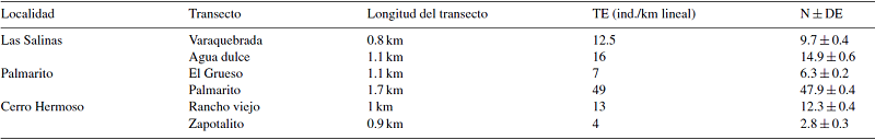En total se obtuvieron 937 registros visuales de cocodrilos durante 48 recorridos, efectuados en 52.8 km durante 24 noches de trabajo. Las TE registradas fluctuaron de 2.3 (transecto Cerro Hermoso) a 33.4 (transecto Palmarito) ind./km lineal; con una TE promedio de 49 ind./km lineal (Tabla 1).