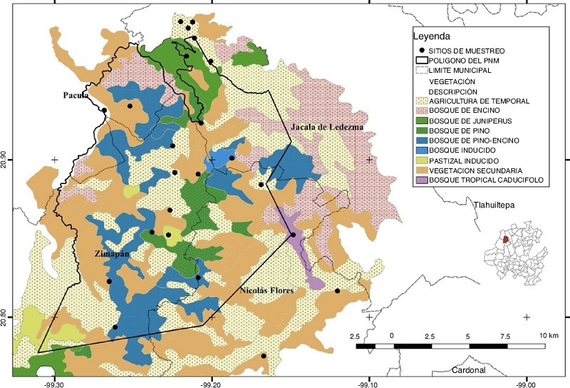 El PNM se encuentra en la parte noroeste del estado de Hidalgo, en la región conocida como sierra Gorda (20°45’39“-20°58’22” N, 99°08’57”-99°18’39” O, Fig. 1) y su territorio incluye los municipios de Jacala de Ledezma, Nicolás Flores, Pacula y Zimapán (Conanp, 2007). Cuenta con una superficie de 23,150 ha y tiene un intervalo altitudinal que va de los 870 a los 3,000 m snm. Se localiza en la provincia fisiográfica denominada Sierra Madre Oriental y en la subprovincia Carso Huasteco, que se caracteriza por presentar rocas sedimentarias del Cretácico, del Jurásico y metamórficas del Paleozoico (Espinoza, Aguilar y Ocegueda, 2004).