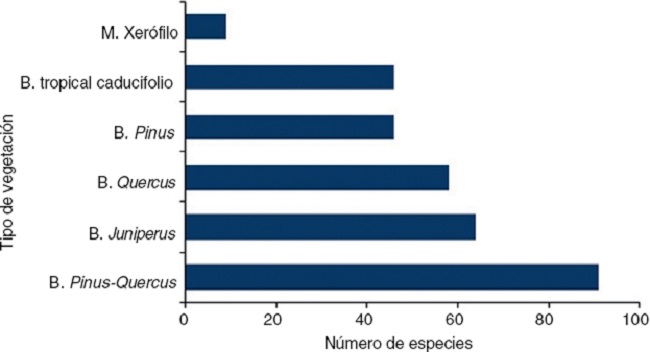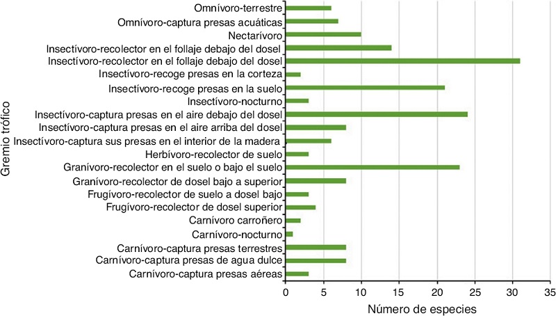 El mayor número de especies de aves se registró en el bosque de Pinus-Quercus (91 especies), seguido por el bosque de Juniperus (64), el bosque de Quercus (57), el bosque de Pinus y el bosque tropical caducifolio (ambas con 46 especies) y el matorral xerófilo (9; Fig. 2). En el PNM se registraron aves de 21 gremios tróficos. Tres de ellos, el de insectívoro de follaje debajo del dosel, el de insectívoro en el aire debajo del dosel y el de granívoro de suelo, presentaron más especies (31, 24 y 23 respectivamente; Fig. 3).