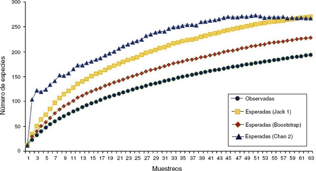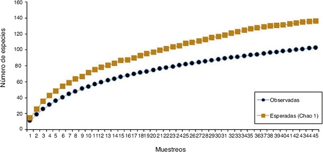 Para determinar el grado en que el listado estuvo completo se utilizaron modelos de acumulación de especies (Herzog, Kessler y Cahill, 2002). Para ello se usaron 2 grupos de datos, aquellos obtenidos solo con el muestreo sistemático (durante los años 2014 y 2015) y considerando todos los datos (tomando en cuenta los datos del muestreo sistemático más los registros casuales). Para ello se utilizó el programa EstimateS Ver. 9.1 (Colwell, 2013), en donde se usó el estimador no paramétrico Chao 1 para el muestreo sistemático, ya que la naturaleza del muestreo permitió utilizar los datos de abundancia de las especies (Magurran, 2004, Moreno, 2001); y para el análisis de todos los datos se usaron los estimadores no paramétricos, Chao 2, Jacknife 1 y bootstrap, porque con ellos se pueden usar datos de presencia-ausencia y no se asume «a priori» un tipo de distribución del conjunto de datos (Moreno, 2001). Los días de muestreo sirvieron como unidad de esfuerzo y la curva se ajustó con base en 100 repeticiones aleatorias de acuerdo al orden de las muestras (Colwell y Coddington, 1994). Con los resultados obtenidos se graficó la riqueza observada y la riqueza estimada. También, se utilizó lo propuesto por Gómez-de Silva y Medellín (2001) como criterio adicional para evaluar si el inventario de especies del área de estudio estaba «completo». Ellos sugieren que una lista está incompleta cuando falta alguna de las 21 familias y 17 géneros «omnipresentes» en México.