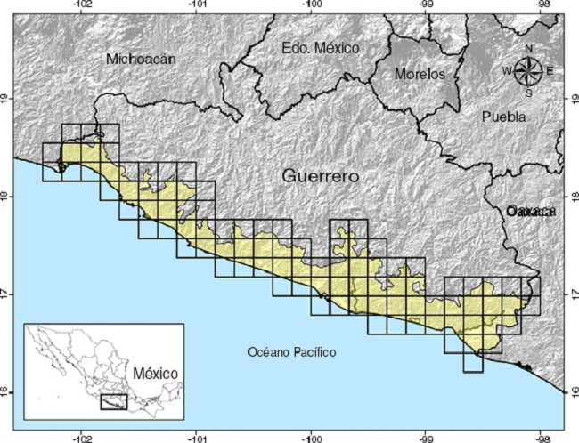 La CPGro se ubica entre los paralelos 16°02’01” y 18°08’59” N, y en los meridianos 98°05’45” y 102°15’30” O. El área de estudio abarca una superficie de 15,026 km2, lo que representa el 23.6% del territorio del estado de Guerrero (63,621 km2; Semarnat, 2014). Colinda al sur con el océano Pacífico, al norte con las montañas de la sierra Madre del Sur, al este con las costas del estado de Oaxaca y al oeste con las costas de Michoacán (Fig. 1). La altitud de la región va desde el nivel del mar hasta pequeñas áreas con elevaciones de hasta 2,000 m snm.