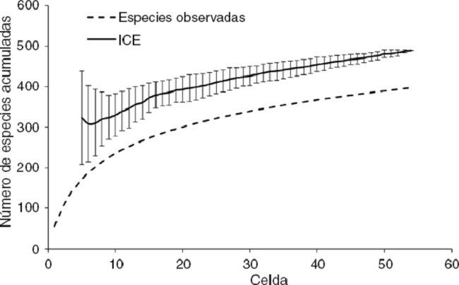Se evaluó la riqueza de especies de las aves de la zona de estudio con el uso del estimador de cobertura basado en incidencia (estimador ICE), usando cuadrantes de 0.17° por lado, los cuales se prefirieron luego de realizarse comparaciones con otros tamaños de celda sin encontrar diferencias claras en los análisis de acumulación de especies y de identificación de áreas de endemismo y de complementariedad. Por otra parte, el estimador ICE basa su cálculo en la estimación de la cobertura de la muestra —i. e., la proporción de la riqueza representada en un conjunto de muestras de incidencia replicados; Colwell y Coddington (1994), Gotelli y Colwell (2011)—, por lo que es insensible al tamaño de muestra (Chazdon et al., 1998, Hortal et al., 2006). El análisis se realizó empleando el programa EstimateS v. 8 (Colwell, 2006), mediante 100 repeticiones aleatorias del orden de las muestras, lo que permite eliminar la influencia que tiene el orden en el cual estas se adicionan al total (Moreno y Halffter, 2000).