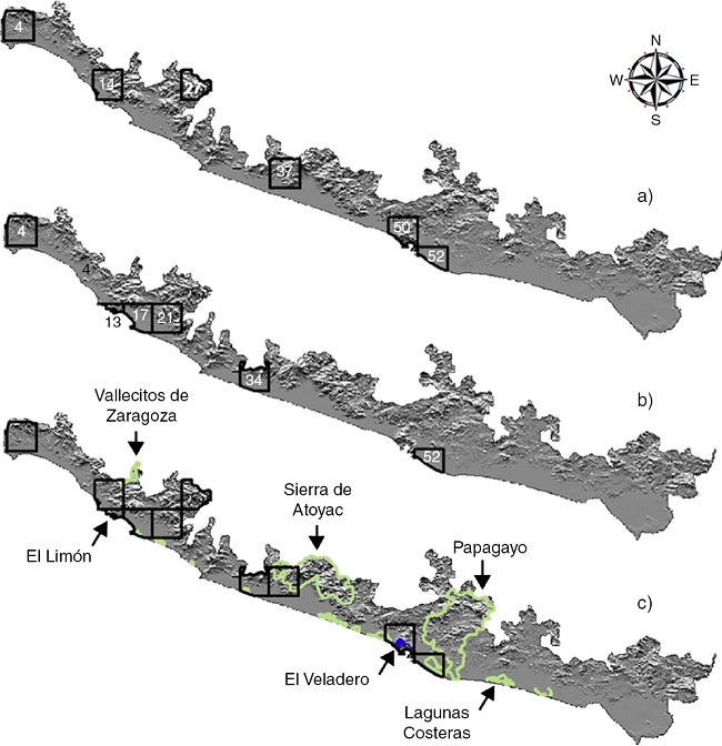 El análisis de complementariedad para la avifauna terrestre mostró que de las 95 celdas en las que se dividió el área de estudio, un total de 6 albergan el 100% de la riqueza estimada a partir de los MDE (265 especies; Fig. 4 a). Estas celdas representan el 17% (2,512 km2) de la superficie total de la CPGro (15,026 km2). En la primera celda (37) existe el 95.5% de la avifauna terrestre modelada en el área de estudio y al localizar las 2 celdas subsecuentes (27 y 50) el porcentaje se incrementó hasta el 99% de la riqueza total (Tabla 1). La mayor cantidad de especies terrestres endémicas y en riesgo para el área de estudio se encontró en la celda 37 (Tabla 1). Para la avifauna acuática (Fig. 4 b), 6 celdas (13, 52, 17, 4, 21, 34) acumularon el 100% de las especies modeladas (Tabla 1); en particular, las celdas 13 y 52 acumularon al total de especies acuáticas en alguna categoría de riesgo. Al sobrelapar las ANP de la franja costera de Guerrero (Reserva Estatal El Limón y Parque Nacional El Veladero), se observa congruencia geográfica total con las áreas complementarias identificadas en este análisis (Fig. 4 c). Por otra parte, las AICA mostraron menor coincidencia con las áreas complementarias (Fig. 4 c). Del total de superficie de las áreas o celdas complementarias en este estudio, el 9% se traslapa con alguna de las AICA.