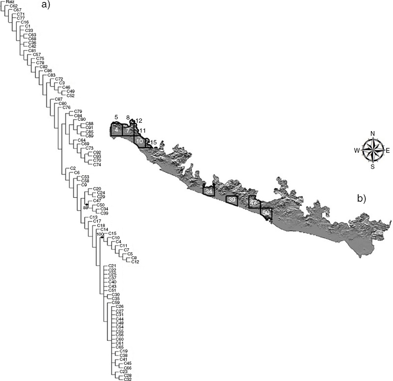 Los resultados del PAE generaron 1,000 cladogramas, de los cuales se obtuvo uno de consenso estricto de 834 pasos (CI: 20, RI: 76) con un soporte de ramas de entre el 88 y el 100% de acuerdo con la prueba de bootstrap (Fig. 5 a). El cladograma de consenso estricto presentó altos niveles de homoplasia, lo que generó algunas politomías (Fig. 5 a); sin embargo, se identificaron 2 áreas de endemismo definidas por al menos 2 taxones (Tabla 2). La primera está representada por las celdas 4, 5, 7, 8, 10-12 y 15, y la segunda por las celdas 34, 39, 40 y 47 (Fig. 5 b). De estas, la celda 4 también fue identificada en el análisis de complementariedad de las aves terrestres y acuáticas (Fig. 4 a y b). Las áreas de endemismo determinadas incluyeron el 91% de la avifauna total modelada (370 especies).