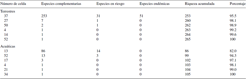 De las 6 celdas identificadas como complementarias para las aves terrestres y acuáticas, solo 2 (4 y 52) coincidieron en ambos análisis. Esto demuestra la diferencia en los hábitos y distribución de cada grupo y, por otro lado, confirma la importancia de estas áreas para especies de relevancia para la conservación (i. e., A. oratrix; Monterrubio-Rico et al., 2016). Por otro parte, si bien el traslape geográfico de estas áreas complementarias con las ANP fue total, nuestros análisis sugieren que estas áreas de conservación oficiales pueden ser ampliadas para incluir un mayor número de especies, así como para facilitar la conectividad entre distintas poblaciones (Bélisle, 2005, Haig et al., 1998).