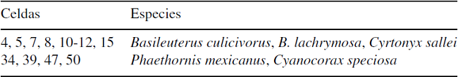 Aunque el gradiente altitudinal de la región es amplio (0-2,000 m snm), las áreas de endemismo presentan pocas variaciones climáticas. Por ejemplo, en las celdas correspondientes a la primer área (4, 5, 7, 8, 10-12, 15) predominan los climas cálidos semisecos y subhúmedos a lo largo de un intervalo altitudinal que va desde el nivel del mar hasta los 1,300 m, lo que explica la presencia de sinapomorfías geográficas características de laderas montañosas del declive costero de la sierra Madre del Sur, como Basileuterus culicivorus, B. lachrymosa y C. sallei (Howell y Webb, 1995). En la segunda área de endemismo (celdas 34, 39, 47 y 50), se presenta un gradiente altitudinal similar con elevaciones hasta los 1,650 m snm (celda 47), por lo que el clima predominante pertenece a los cálidos semisecos y subhúmedos, excepto la celda 39, que presenta un clima semiárido cálido. Estas celdas están también sustentadas por especies características de laderas montañosas semihúmedas (P. mexicanus, C. speciosa). Algunas de las especies que apoyan los clados en las 2 áreas identificadas representan poblaciones diferenciadas a las del resto del país (C. sallei, C. speciosa, P. mexicanus), cuya distribución comprende el declive montañoso del Pacífico, particularmente de los estados de Guerrero y Oaxaca (Navarro-Sigüenza y Peterson, 2004), una región altamente importante por su nivel de endemismos (Navarro-Sigüenza et al., 2016).