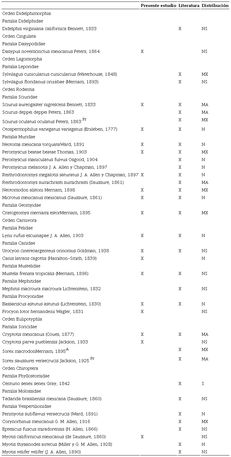 Sciurus aureogaster nigrescens Bennett, 1833. Ejemplares colectados (4): CNMA 42788, 42790, 42791, 42792. Otospermophilus variegatus variegatus (Erxleben, 1777). Ejemplares colectados (1): CNMA 45036. ♂, 500-240-55-20≡1000. Neotoma mexicana torquataWard, 1891. Ejemplares colectados (2): CNMA 42804, 42805. Peromyscus beatae beatae Thomas, 1903. Ejemplares colectados (1): CNMA 44805. ♂, 185-100-21-20≡18. Reithrodontomys megalotis saturatus J. A. Allen y Chapman, 1897. Ejemplares colectados (10): CNMA 44806, 44807, 44808, 44809, 44810, 44811, 44812, 44813, 45039, 45040. Medidas promedio (intervalo) de 9♂, 1♀. LT: 147.3 (130-160), CV: 76 (62-85), PT: 18 (14-20), O: 16 (13-21), peso 13.4 (10-17). Neotomodon alstoni Merriam, 1898. Ejemplares colectados (18): CNMA 42806, 42807, 42808, 42809, 42810, 44795, 44796, 44797, 44798, 44799, 44800, 44801, 44802, 44803, 44804, 45700, 45701, 45702. Medidas promedio (intervalo) de 8♂ y 5♀. LT: 196.6 (161-280), CV: 82.8 (69-95), PT: 24.6 (22-27), O: 22.2 (17-27), peso 38.2 (25-52). Microtus mexicanus mexicanus (Saussure, 1861). Ejemplares colectados (5): CNMA 42800, 42801, 42802, 42803, 45699. 1♂, 145-34-20-19≡30. Cratogeomys merriami estorMerriam, 1895. Ejemplares colectados (9): CNMA 42793, 42794, 42795, 42797, 42798, 44792, 44793, 44794, 45037. Medidas promedio (intervalo) de 1♂ y 3♀. LT: 272.8 (225-232), CV: 40.8 (17-84), PT: 37.5 (33-43), O: 6 (4-8), peso 672.3 (192-1500). Lynx rufus escuinapae J. A. Allen, 1903. Ejemplares colectados (1): CNMA 47897. Mustela frenata tropicalis (Merriam, 1896). Ejemplares colectados (1): CNMA 42786. Bassariscus astutus astutus (Lichtenstein, 1830). Ejemplares colectados (2): CNMA 44790, 45034. Procyon lotor hernandezii Wagler, 1831. Ejemplares colectados (1): CNMA 45035. Cryptotis mexicanus (Coues, 1877). Ejemplares colectados (11): CNMA 42773, 42774, 42775, 42776, 42777, 42778, 42779, 42780, 42781, 44786, 44787. Medidas de 1♀: 100-31-13-5≡9; 1?: 90-25-13-2≡?. Cryptotis parva pueblensis Jackson, 1933. Ejemplares colectados (2): CNMA 42782, 42783. Myotis californicus mexicanus (de Saussure, 1860). Ejemplares colectados (2): CNMA 44788, 44789. Medidas de 1♂: 72-35-7-12-30≡5 y 1♀: 78-37-6-14-31≡25.