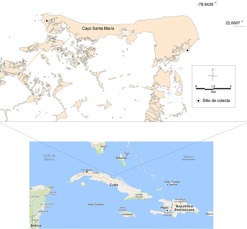 Los especímenes se detectaron el 21 de diciembre de 2016, en 2 sitios del sublitoral somero: 22°39′47″ N, 79°05′12″ O (canal interior en bosque de Rhizophora mangle); 22°38′29″ N, 78°57′57″ O (entre individuos de Rhizophora mangle); en Cayo Santa María, centronorte de Cuba (Fig. 1). Se recolectaron manualmente 30 fragmentos independientes de varias plantas detectadas sobre fondo arenofangoso, en profundidades inferiores a los 0.4 m, y se trasladaron en agua de mar para su identificación a posteriori en el laboratorio.