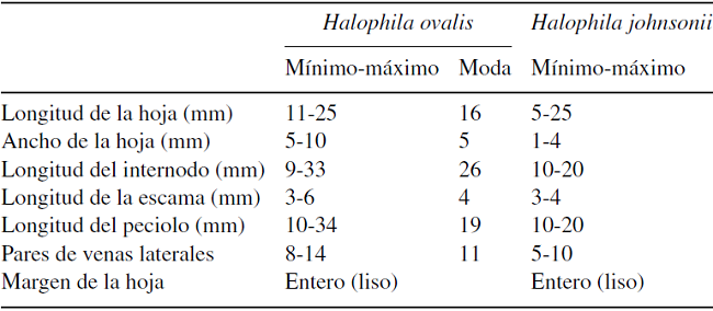 Las variaciones en los caracteres morfológicos cuantitativos de H. ovalis de nuestra nota se corresponden a lo publicado para esta especie por Short et al. (2010). Es relevante la similitud morfológica con H. johnsonii, difiriendo solamente en algunas medidas fenotípicas que pudieran ser resultado de la respuesta a algún factor ambiental del hábitat donde se está desarrollando (Tabla 1). Short et al. (2010) no encontraron divergencias de nucleótidos para secuencias de ADN ribosomal (Uchimura et al., 2008, Waycott et al., 2002) entre ambas especies, lo cual evidencia la necesidad de revisión de la validez de las mismas como taxones diferentes.