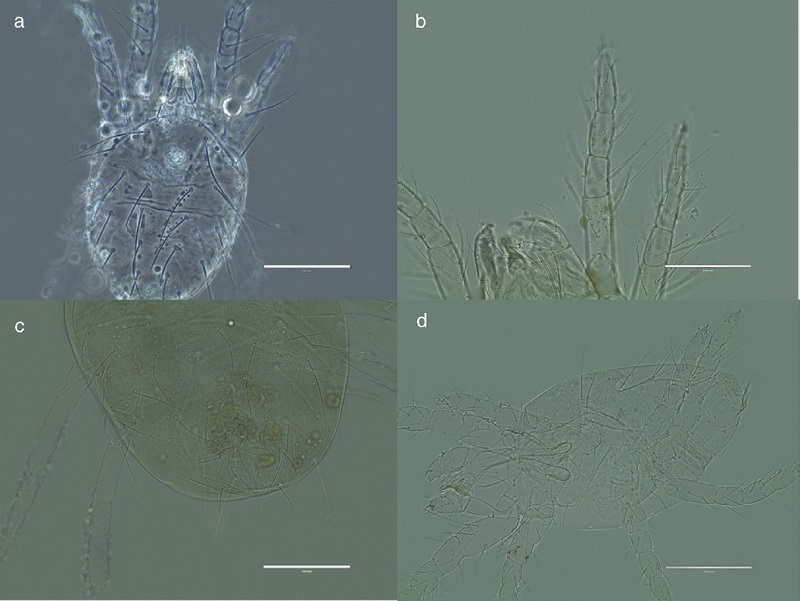 La zona en estudio se caracteriza por una humedad relativa del 75.8%, una precipitación anual de 494 mm, una temperatura media diaria de 13.5 °C y una velocidad del viento de 1.6 m/s (http://www.serviciometeorologico.gob.ec/, consultado el 28 de septiembre de 2016). Durante el muestreo fueron observadas poblaciones de ácaros tetraníquidos que fueron evidenciadas por los síntomas de amarillamiento en plantas de zanahoria blanca (Fig. 1), mientras que en plantas de mashua las poblaciones eran menores, por lo que aún no se evidenciaban síntomas de alimentación. Las muestras de hojas infestadas con ácaros fueron llevadas al laboratorio de Sanidad Vegetal de la Facultad de Ciencias Agropecuarias y examinadas bajo aumento del microscopio estereoscópico, donde fueron observados todos los estados de desarrollo del ácaro. Posteriormente, los especímenes fueron montados usando líquido de Hoyer para observación al microscopio óptico.