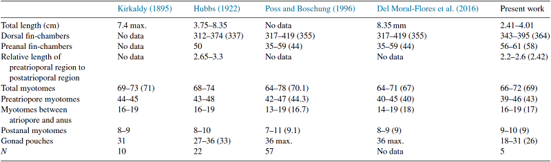 Description. Body elongate. Ratio of body length to body depth 11.7 (10.4–13.2). Ratio of preatriopore length to postatriopore length 2.42 (2.2–2.6). Notochord extends forward of the oral hood and forms a well-developed rostral process. Buccal region with numerous fine cirri (up to 40), some of them longer than the tip of the rostrum. Rostral fin thickened and round termination. Myotome formula: preatriopore 43 (39–46) + atriopore-anal 17 (16–19) + postanal 9 (9–10) = total 69 (66–72). Dorsal fin of moderate height. Dorsal fin-chambers 364 (343–395). Preanal fin-chambers 58 (56–61). Ratio of body length to body depth 12.06 (10.4–13.36). Caudal fin with expansions of dorsal and ventral fins long and shallow. Anus located far behind middle of lower lobe of caudal fin. Color of body white and fins translucent.