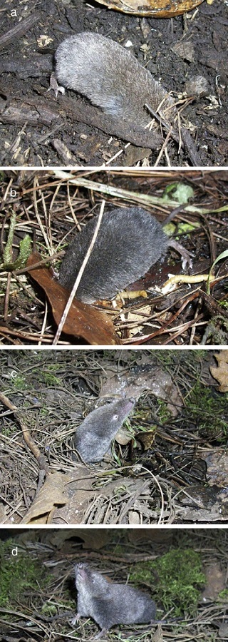 The shrews showed high burrowing activity, and spent nearly all of their time underground. They ate large quantities of food every day, from 80 to 100% of their body weight, and were extremely active from the first hour after sunset to until about 2 h after dawn. The 2 individuals commonly made and used tunnels at a depth of 2–3 cm from the soil surface through vigorous use of the manus and claws (Fig. 1a, 1b). To catch prey, the shrews alternated between subterranean tunnels and surface runways. When the shrews used tunnels, they dug open holes to the surface to breathe and find prey (Fig. 1c). Once they found their prey, they pursued them immediately above surface, which could be motivated by sense of smell or taste (Fig. 1d; Saarikko, 1989). Shrews also stored raw beef underground when they had enough food to consume immediately. Food hoarding behavior might be beneficial if it reduces the frequency of interactions with competitors or predators, or when food supply is unpredictable (Rychlik & Jancewicz, 2002).