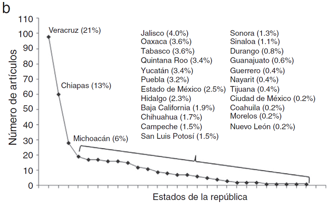 Realizamos una búsqueda (8 de marzo de 2016), a través de la base de datos de Web of Science, de artículos científicos que tuviesen la palabra «landscape» o «paisaje» en el título, en el resumen y/o en las palabras clave, dentro de las áreas de investigación de ciencias biológicas, ecológicas, ambientales y de conservación biológica. Considerando solo los trabajos realizados en México, encontramos 546 artículos científicos (Anexo. Material suplementario). Sin embargo, excluyendo aquellos artículos que no trataban sobre EP (i.e., considerando los temas descritos arriba), obtuvimos una base depurada de 472 artículos sobre EP (Anexo. Material suplementario). Estos artículos fueron publicados entre 1992 y 2016, pero el 95% de estos estudios lo fueron a partir del año 2000 (Fig. 1a). Los estudios fueron realizados en el Distrito Federal y en 26 estados de la república. La mayoría (n = 369 estudios, 78%) fueron realizados en un solo estado, 78 estudios (17%) incluyeron más de un estado y 25 estudios (5%) son teórico-conceptuales y/o de modelación, por lo que no se enfocan en ningún estado en particular. Veracruz (n = 98 estudios) y Chiapas (n = 60) son los estados que cuentan con un mayor número de estudios. Más de la mitad de los estudios realizados en Veracruz (n = 54) fueron realizados en la región de Los Tuxtlas. En contraste, 10 estados cuentan con entre 11 y 28 estudios, mientras que el Distrito Federal y otros 15 estados cuentan con menos de 10 estudios (Fig. 1b).