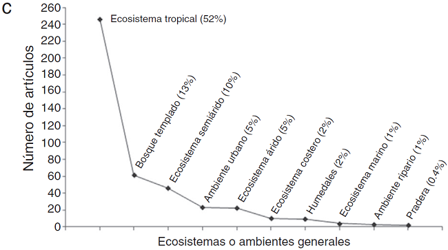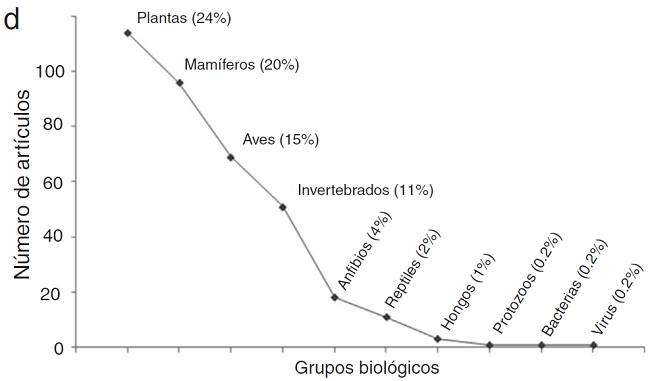 Registramos estudios realizados en 10 tipos de ecosistemas (Fig. 1c). La mayoría (426 estudios, 90%) se enfoca en un solo ecosistema, 32 estudios (7%) incluyen más de un ecosistema y 14 estudios (10%) no se enfocan en ningún ecosistema particular. Más de la mitad de los estudios (n = 246) fueron realizados en ecosistemas tropicales, seguido por bosques templados (n = 61), ecosistemas semiáridos (n = 46), ambientes urbanos (n = 23) y ecosistemas áridos (n = 22). El resto de ecosistemas cuentan únicamente con entre 2 y 10 estudios (Fig. 1c). En relación con los grupos biológicos evaluados, la mayoría (n = 332, 70%) se enfoca en un solo grupo, 28 estudios (6%) evalúan más de un grupo y 112 estudios (24%) no se enfocan en un grupo particular (Fig. 1d). Los grupos biológicos más estudiados son las plantas (n = 114 estudios), los mamíferos (n = 96) y las aves (n = 69), que en conjunto representaron el 59% de los estudios evaluados (Fig. 1d).